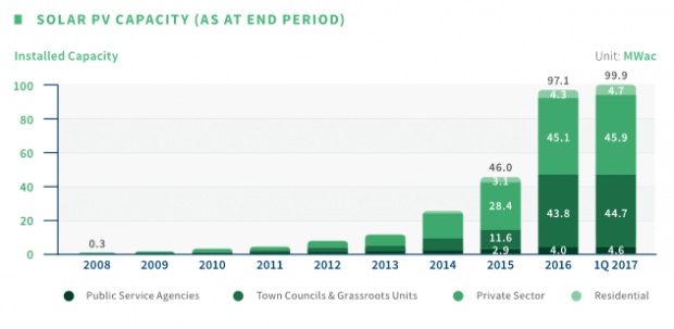 EMA berkata bahawa pertumbuhan besar dalam sistem PV didorong terutamanya oleh 995 pemasangan baharu pada suku pertama 2016 dan pada suku pertama tahun ini. Sehingga akhir Q1 2017, Singapura mempunyai sejumlah 1898 pemasangan PV solar.